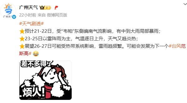 @广东天气 预计,22日起,台风对广东的风雨影响明显减弱。