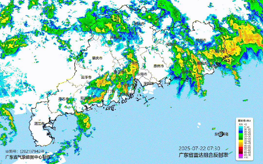22日,珠三角南部和粤西有大雨局部暴雨,粤东市县中到大雨局部暴雨,其余市县有中(雷)阵雨,局部暴雨。最高气温:全省大部分市县介于29~33℃。