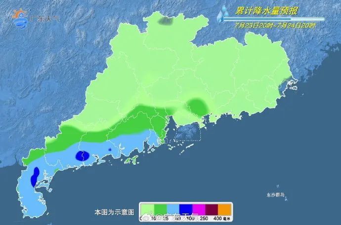 24日,珠三角南部和粤西市县有中到大雨局部暴雨,其余市县有(雷)阵雨,局部暴雨。最高气温:全省大部分市县介于32~35℃。