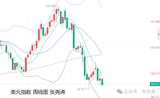其日图走势,近日持续运行在中轨及短期均线下方,布林带开口向下延伸,附图指标也维持空头信号发展,暗示后市前景偏弱,走势将继续看空,而会支持金价。另外,周图走势也是如此,之前的反弹未能突破持稳5-10周均线阻力,并重回其下方运行,空头前景加强,月图走势也如期遇阻再度走低,继续等待回落下探93目标,而会持续支持金价。使金价其再度上探3500美元,或更高位置。
