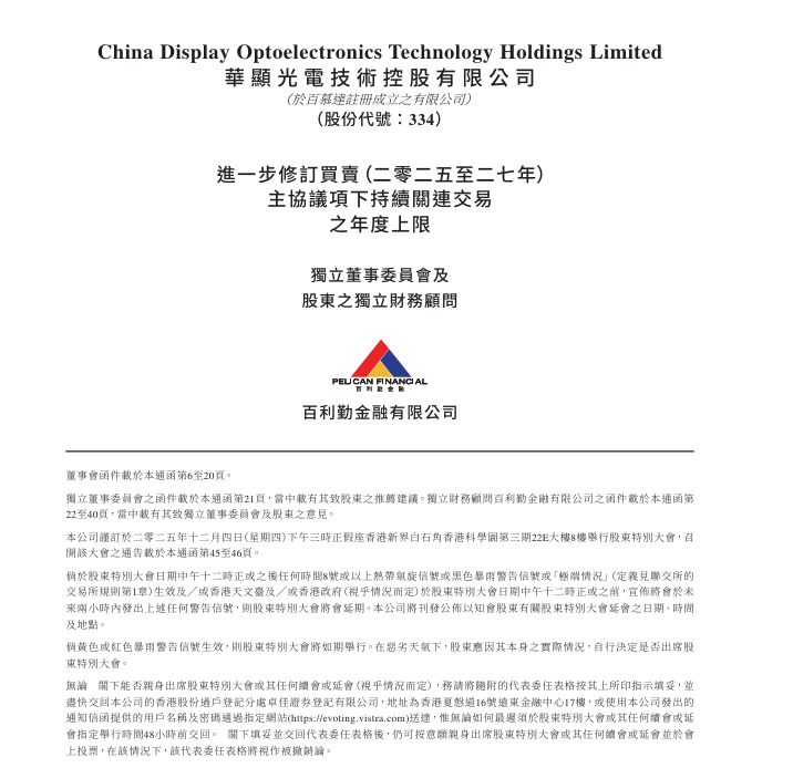 11月18日,华显光电公告修订2025-2027年主协议项下向TCL科技集团产品销售年度上限,2025年上限由42亿元提至50亿元,因终端客户订单激增,预计年末销售额达49.6亿元超原上限。2026-2027年销售、采购上限及收益限额不变,协议其他条款维持原样。
